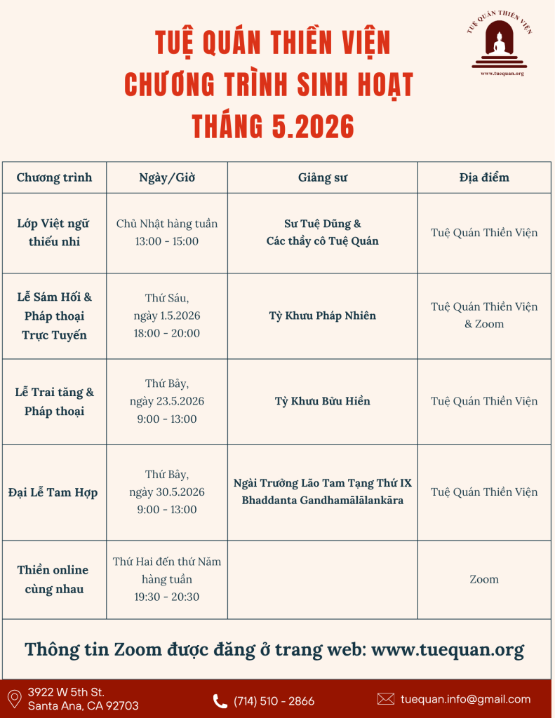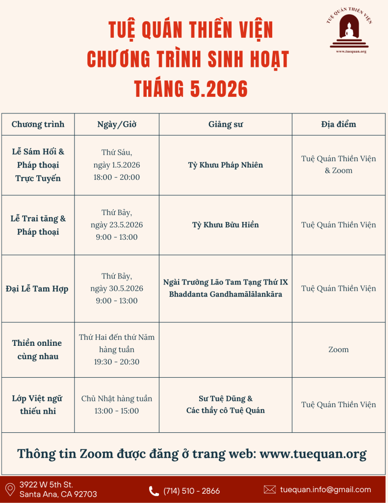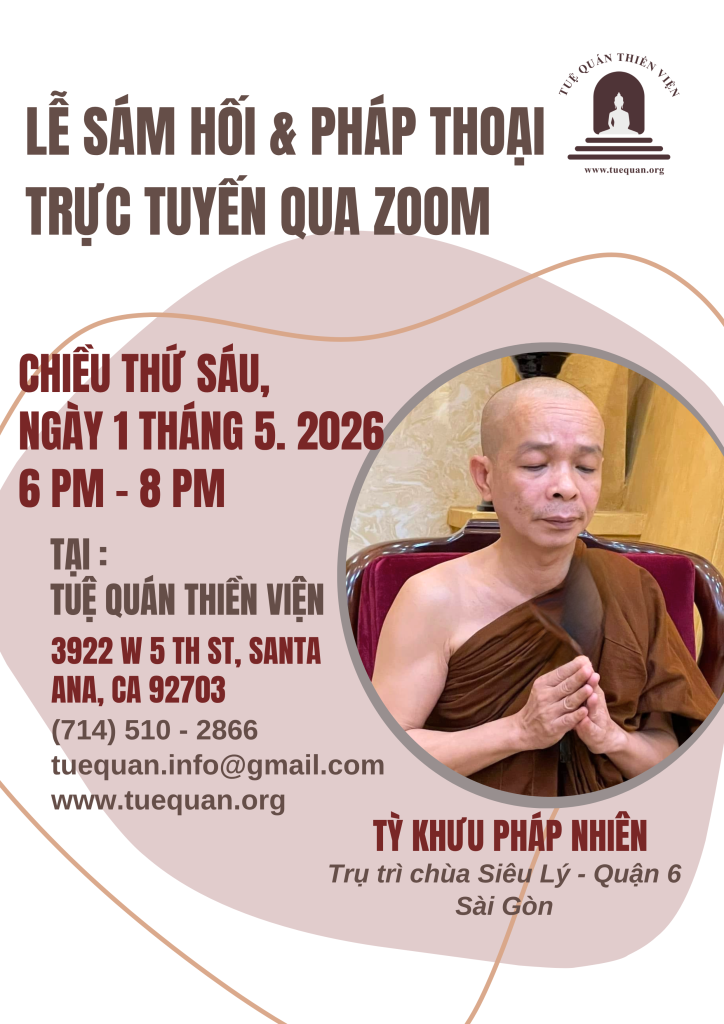 Thứ năm, ngày 02 tháng 4 năm 2026 Thời gian: 6 PM – 8 PM Thượng Tọa Minh Mẫn thuyết pháp trực tiếp qua zoom Zoom ID: 962 8613 0172Passcode: 540384 Zoom link Join our Cloud HD Video Meeting Mời quý Phật Tử đến Tuệ Quán Thiền Viện tham dự Liên hệ: tuequan.info@gmail.com 3922 W 5th […]
